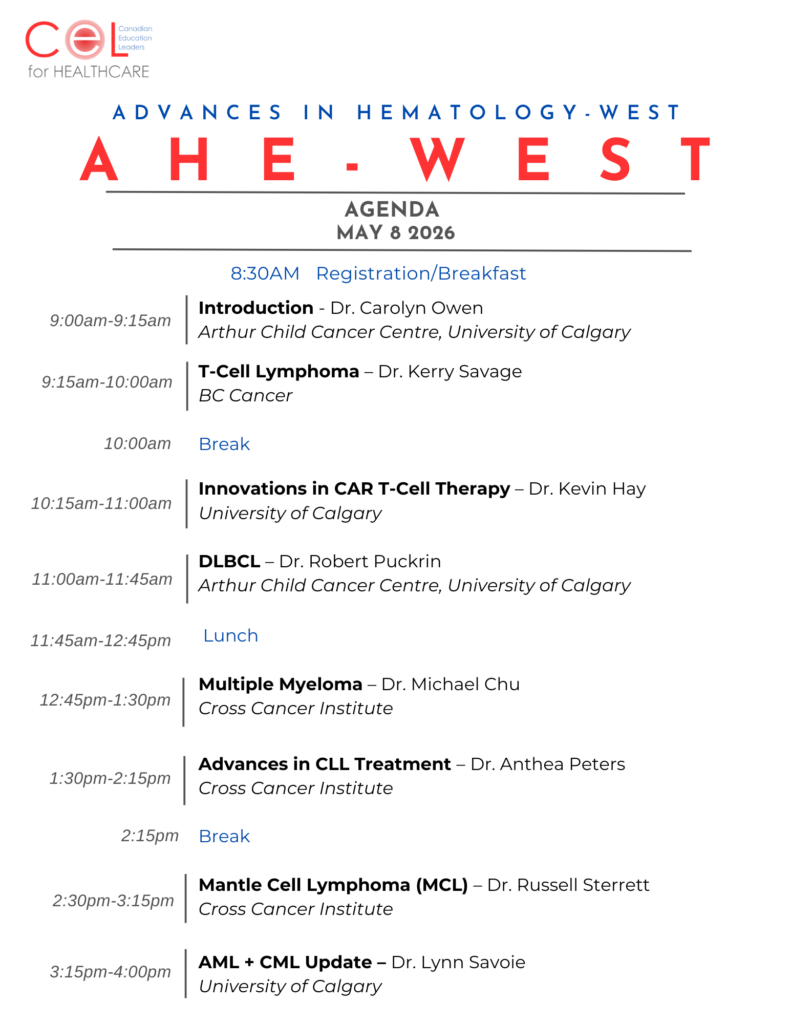 Join us at second annual AHE-WEST 2026 – Advances in Hematology – WEST, taking place on May 8, 2026, in Calgary. Chaired by Dr. Carolyn Owen (Arthur Child Cancer Centre, University of Calgary), this regional meeting will bring together leading experts to explore key developments in hematology, including emerging therapies, evolving treatment strategies, and innovations shaping clinical practice. This event offers a unique opportunity to connect with colleagues, engage with expert faculty, and stay current on the latest advances in the field. We look forward to welcoming you!
